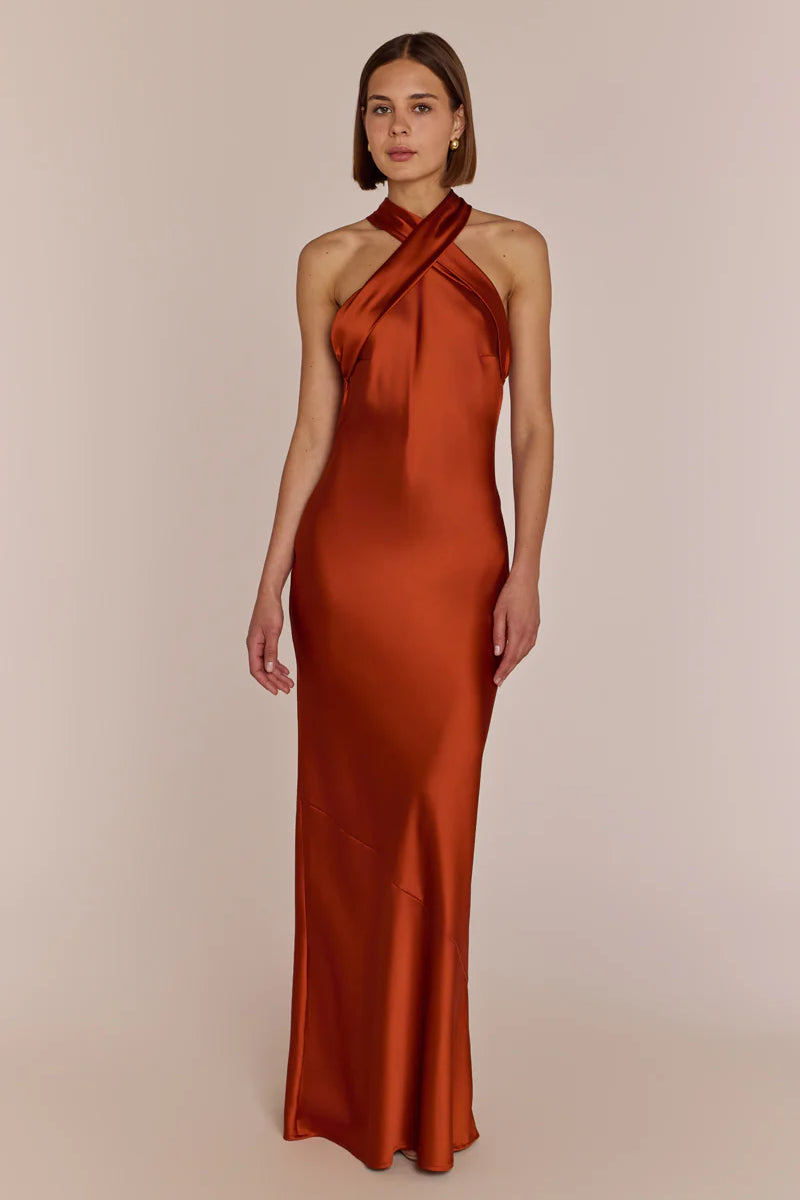 REWRITTEN Roma Bridesmaid Dress in Burnt Orange Satin