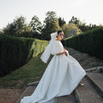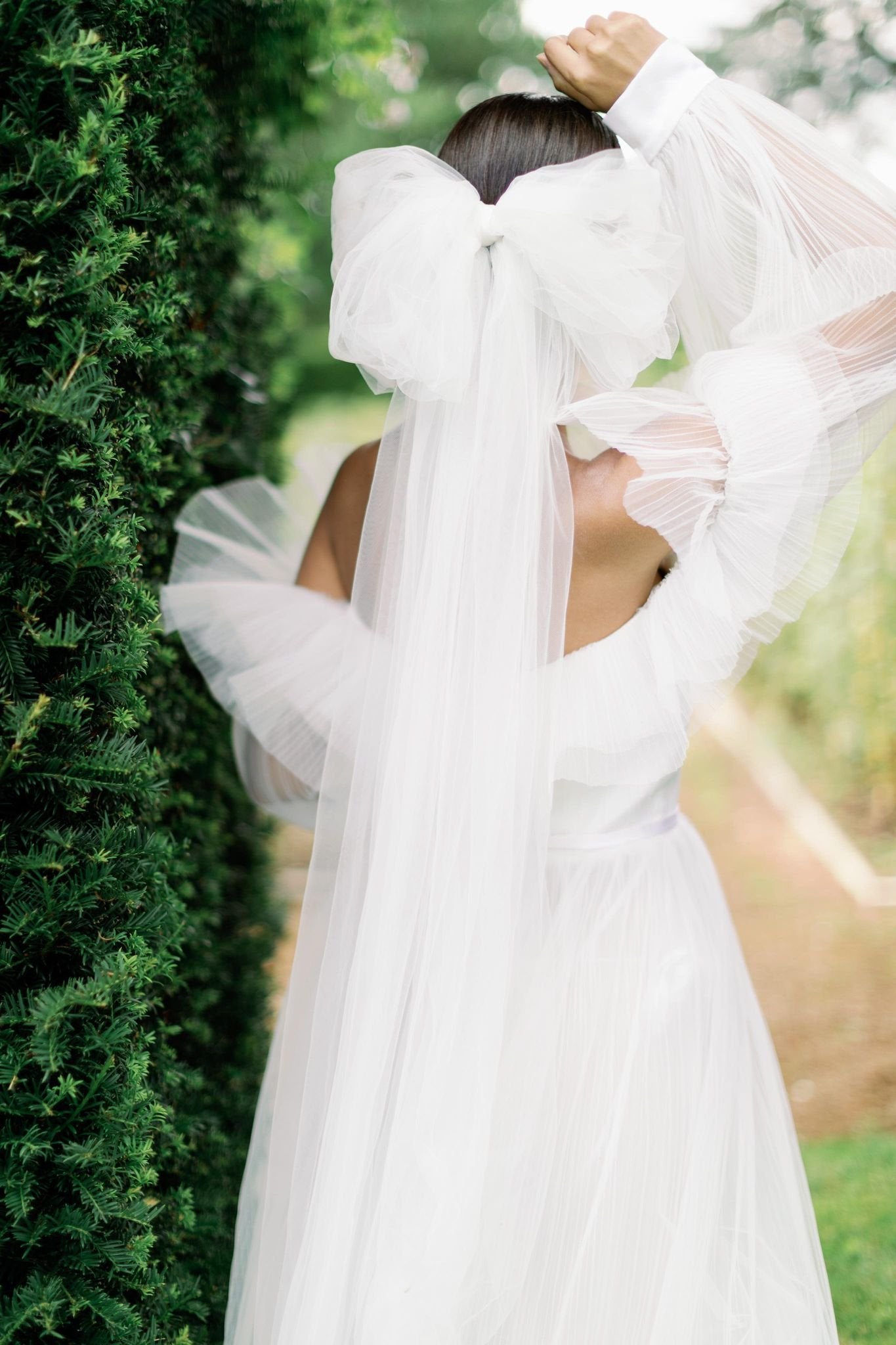 Beautiful Italian soft tulle veil in the shape of a large bow. Available in a variety of colours upon request. Ivory is pictured. Fingertip length. Other lengths are also available upon request. Comb fixture to apply into the hair.