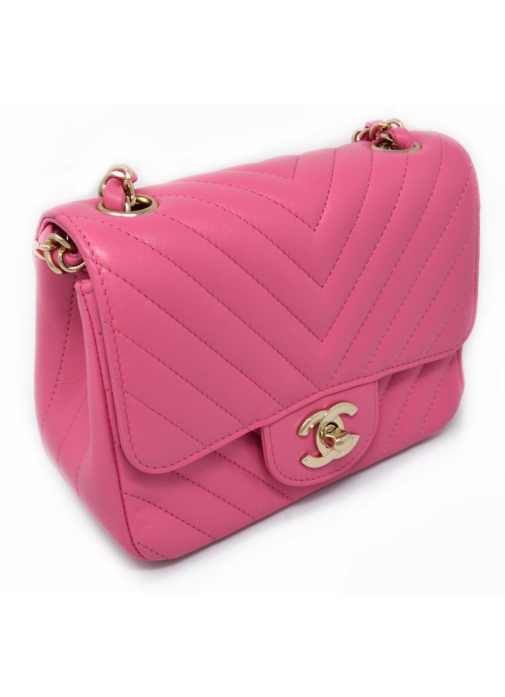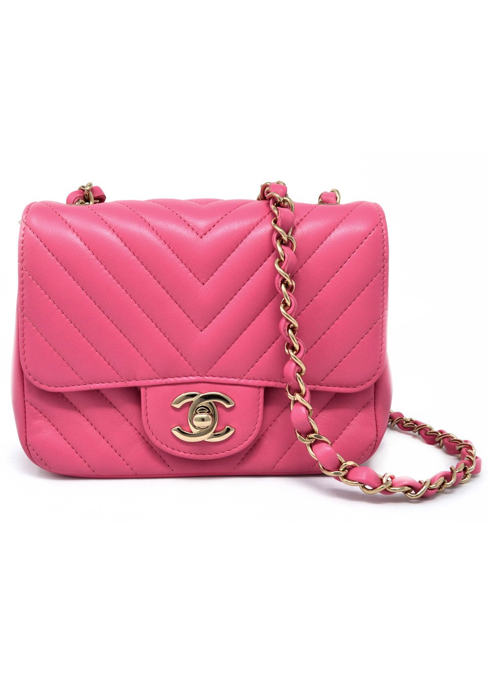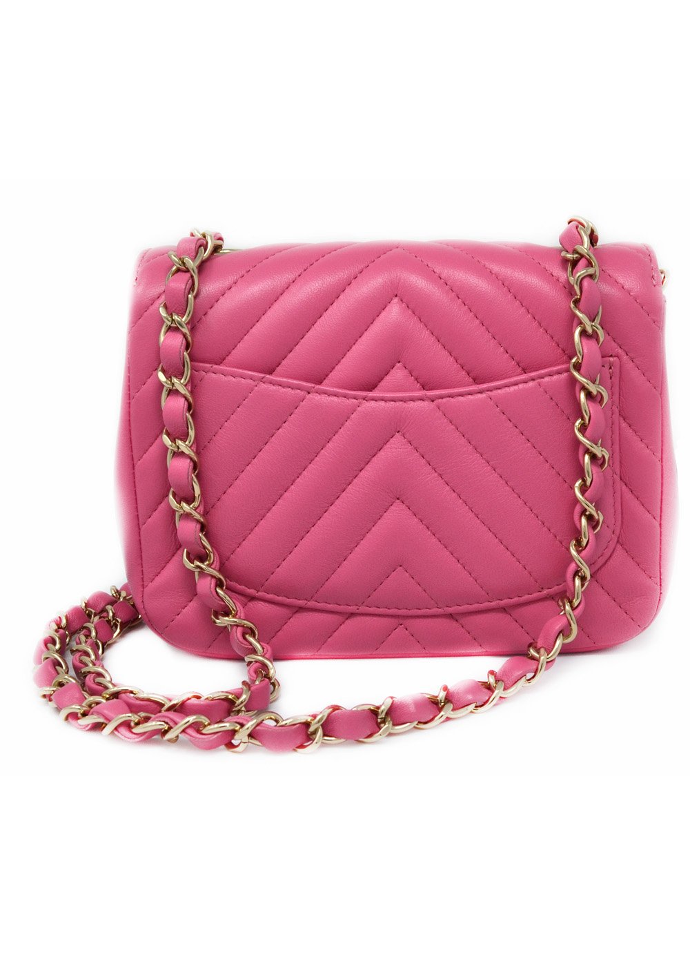 In pink chevron lambskin with gold-tone metal hardware, this Chanel Mini Flap adds an ultra-feminine colour pop to your look.