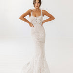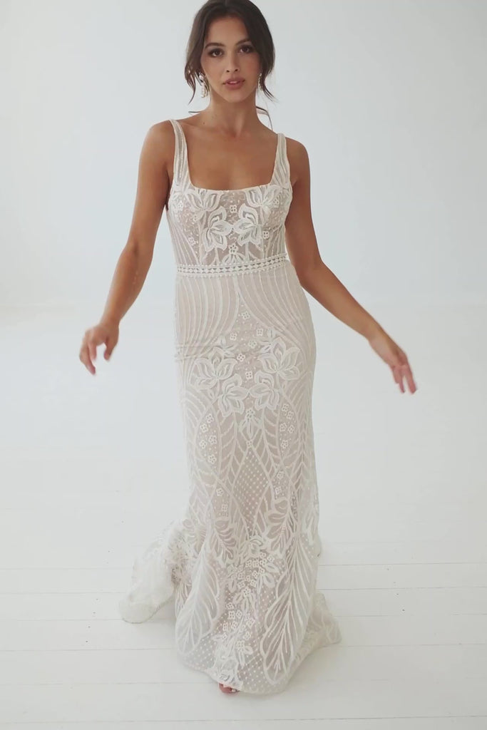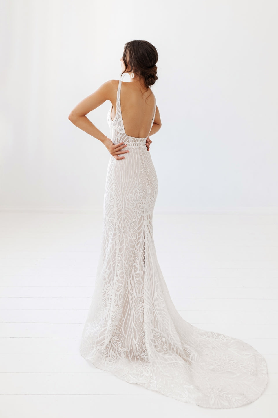 Made for the haute bohemian, the Promise gown is designed to accentuate the shape of the body through a series of carefully designed flourishing patterns.