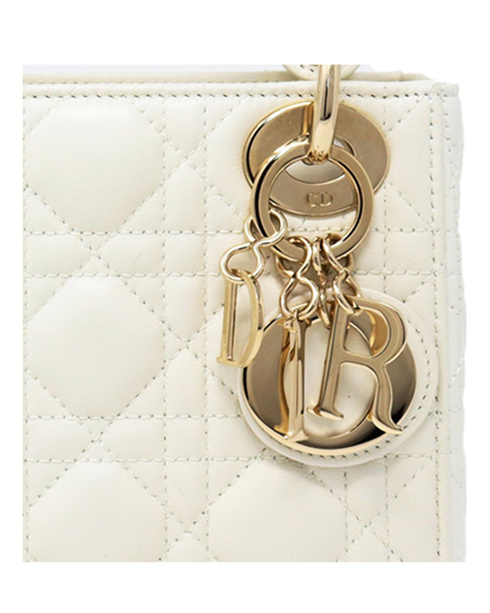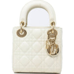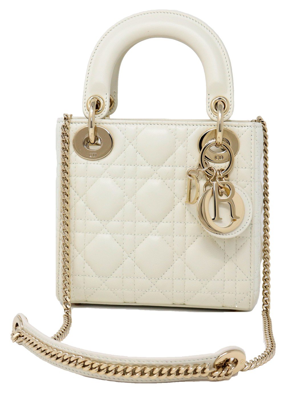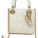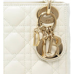 In warm white lambskin, our mini Lady Dior bag is an elegant delight. Featuring gold tone metal charms and a detachable chain and leather strap, this is a beautiful occasion bag, whatever the occasion.