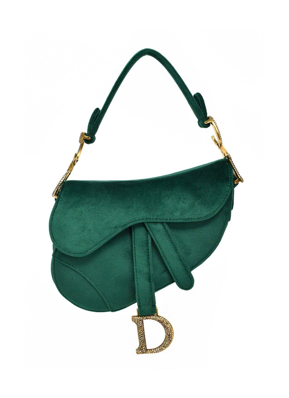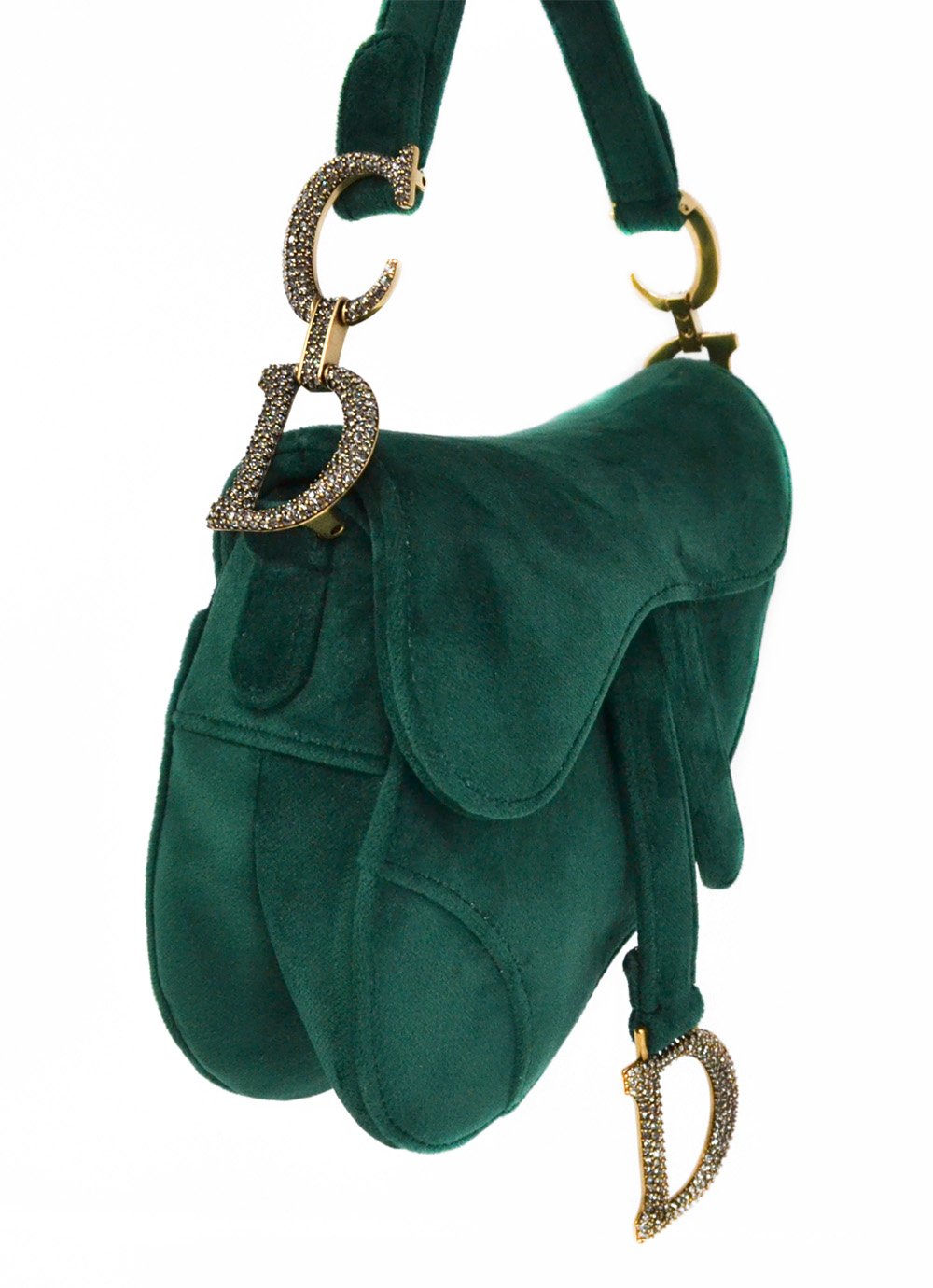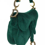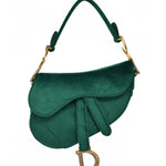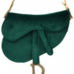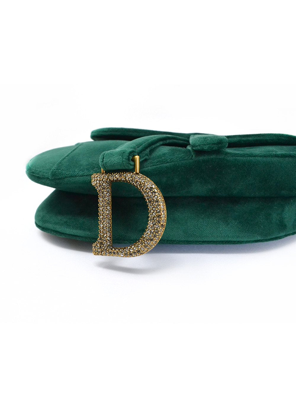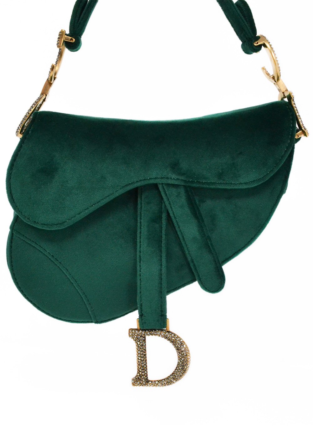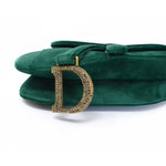 Our Green Velvet Dior Mini Saddle is sheer perfection in bag form. The green velvet edition is a Harrods exclusive and features the CD logo in beautiful aged gold-tone metal and rhinestones. Perfectly at ease in all the best places this gem adds a chic aesthetic to any outfit.