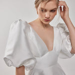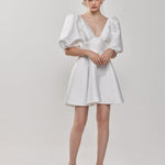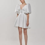 Features dramatic puff sleeves, a wide plunge V-neckline with an accentuated waist panel, and a playful mini circle skirt that reveals pockets.