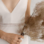 Modern luxury redefined, the Journey gown features a flattering V-neckline adorned with delicate pearl hand-beaded embellishments. A bold, embroidered waistband of cut-out details define the waistline and a fit-and-flare silhouette made of our bonded crepe georgette fabric perfectly embraces the feminine figure in all the right places.