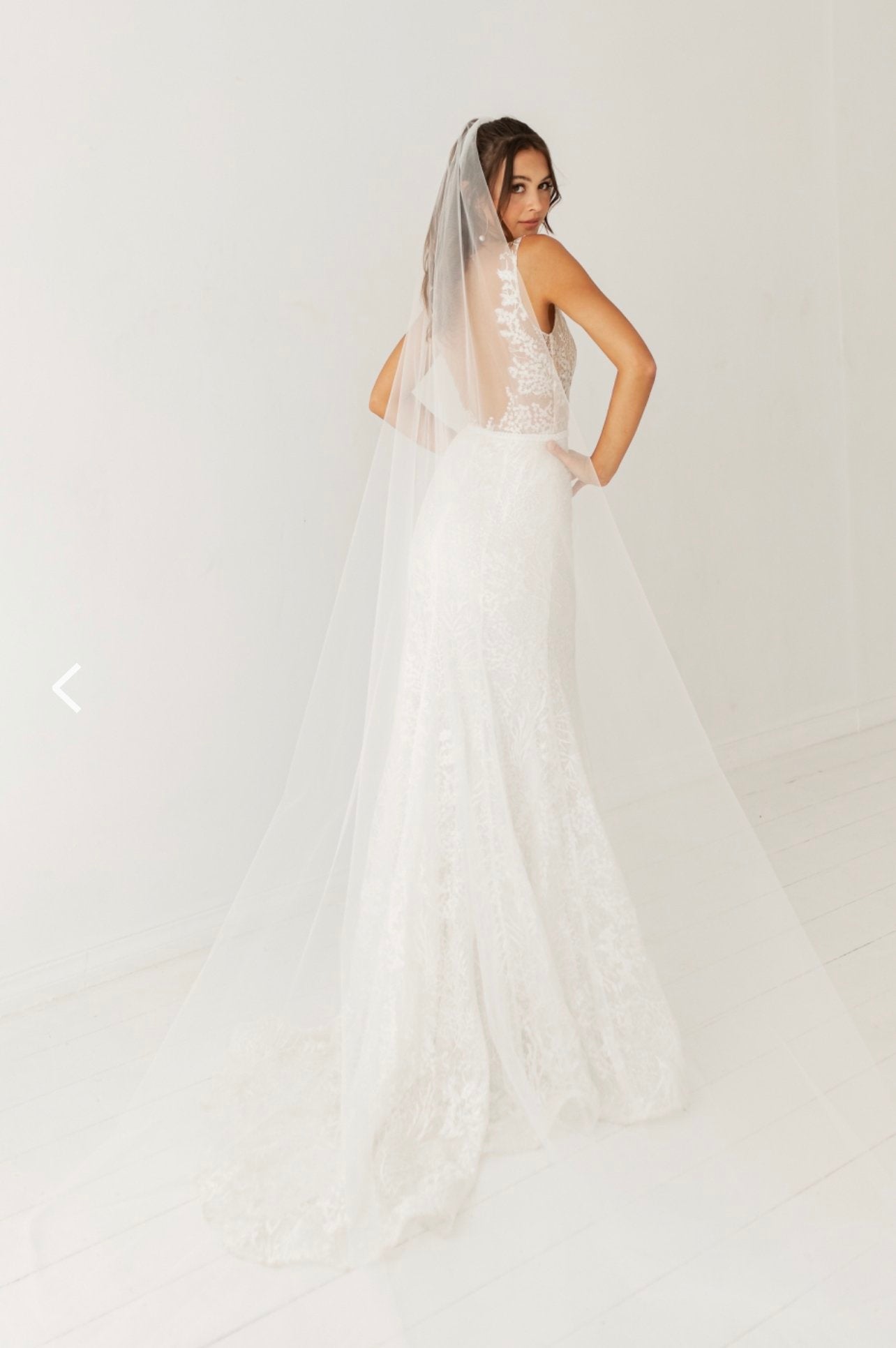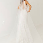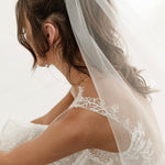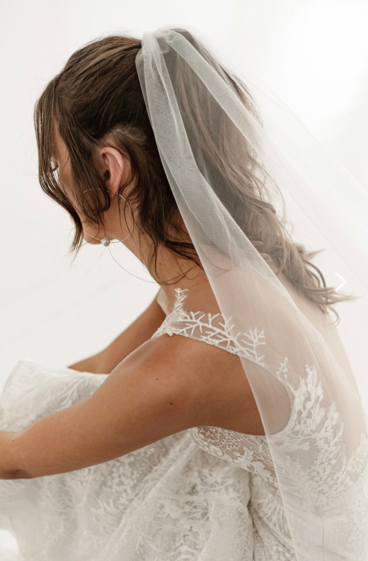 Made for the modern bride who wants a bridal moment, this veil is worn at the back of the head and suits an array of different hairstyles.