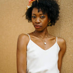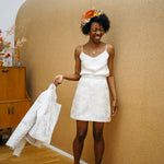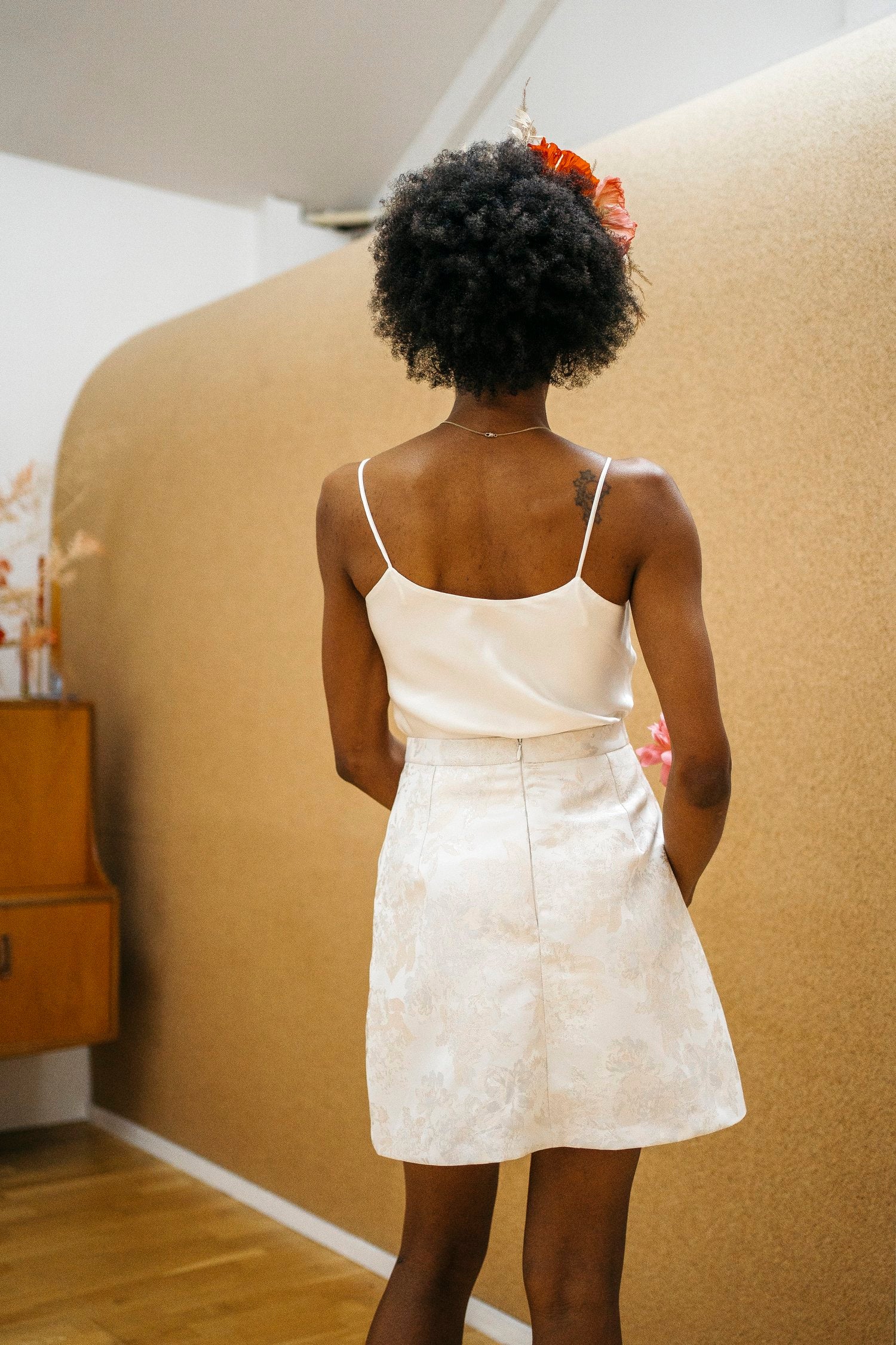Simple but elegant, the bias-cut silk camisole top is perfect for pairing with the Biker mini skirt, and will fit in perfectly into your wedding wardrobe to wear in so many different ways. It is lined with silk satin which feels luxurious against the body.