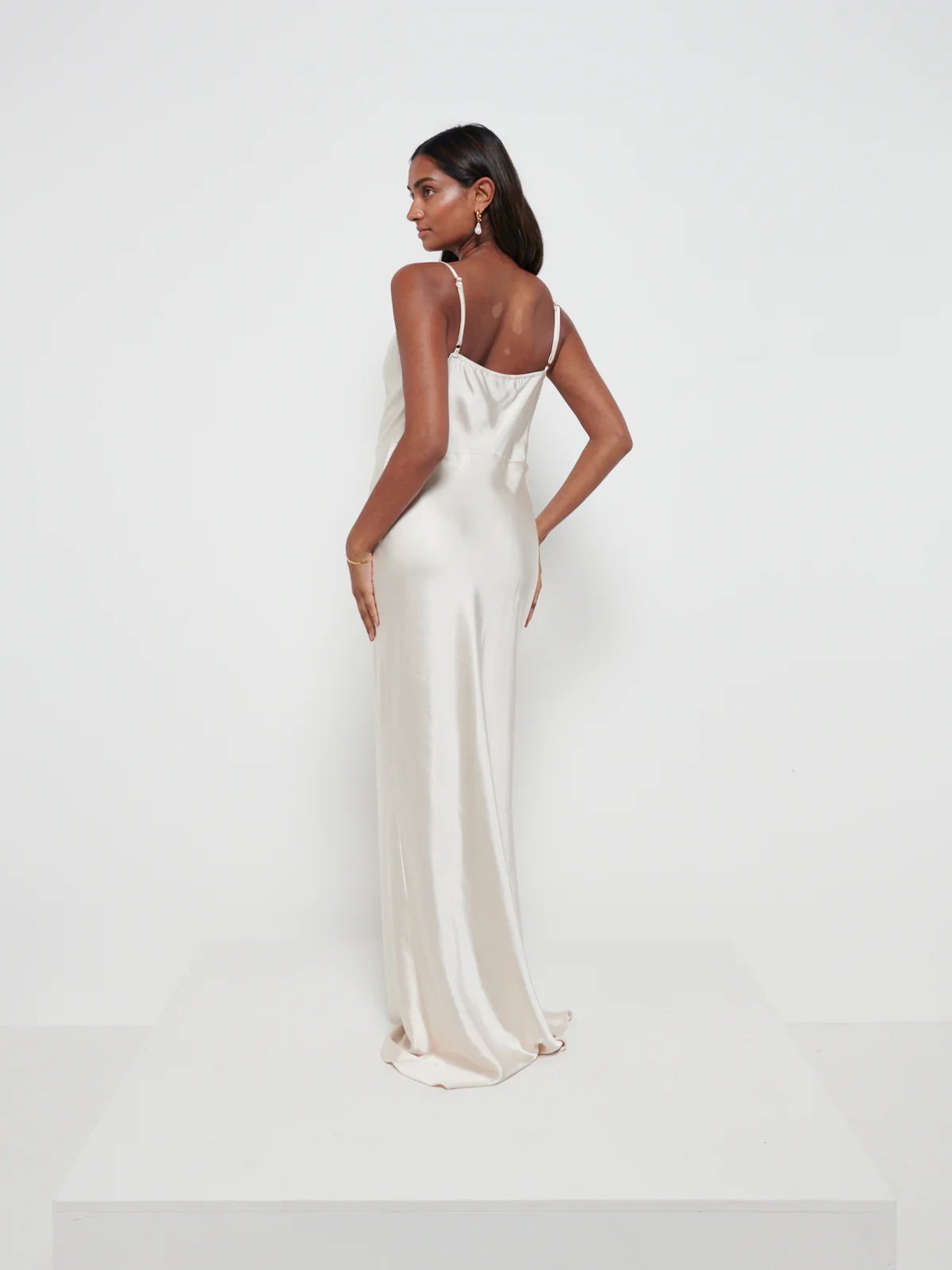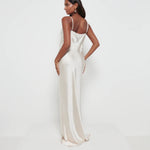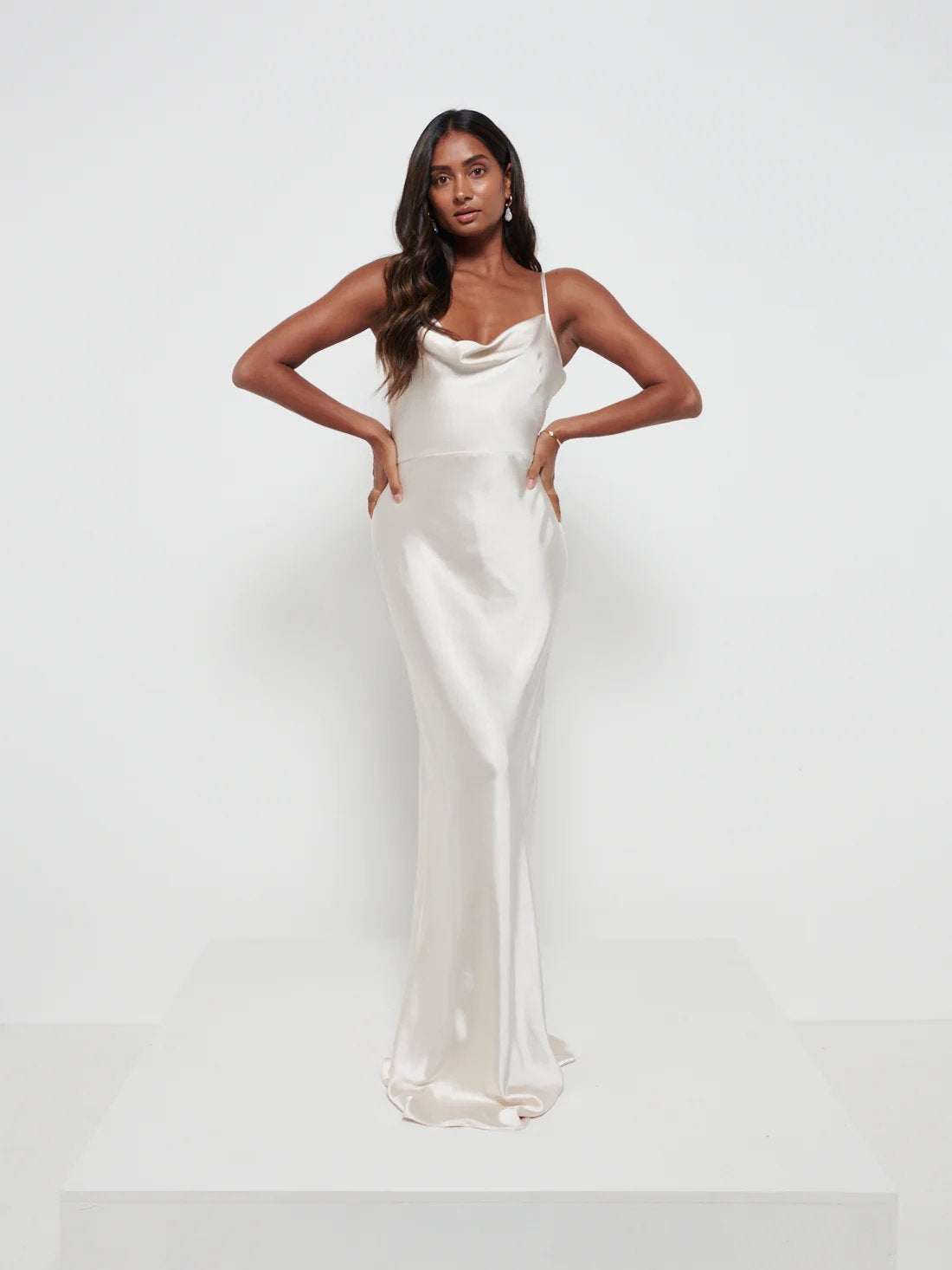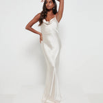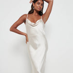 Made out of a luxurious satin with a silk feel and lavish sheen. It has been intricately designed with a flattering cowl neckline and spaghetti straps to give a simplistic, feminine look. The maxi-length drapes beautifully to the floor, your bridesmaids will feel their best on your big day.