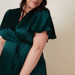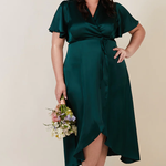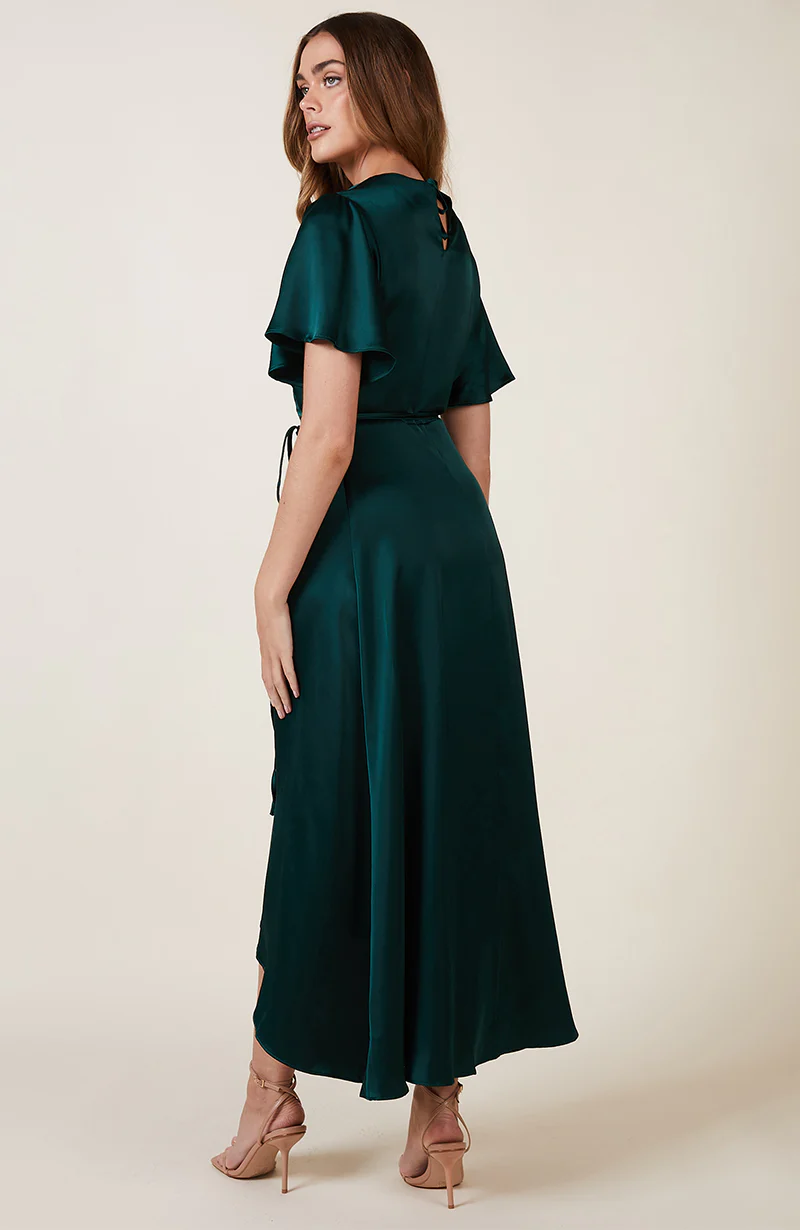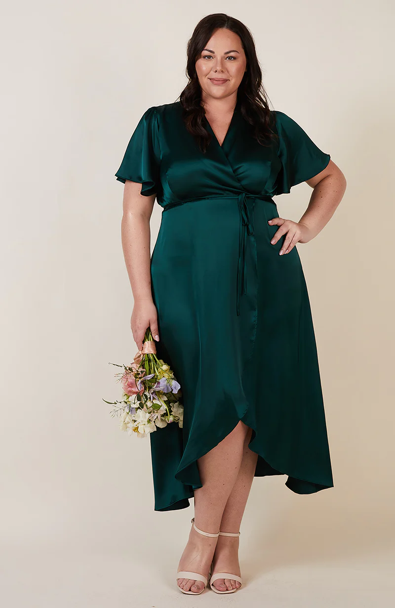 The Florence Waterfall hem bridesmaids wrap dress is crafted in the most beautiful satin.