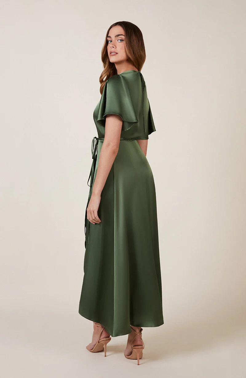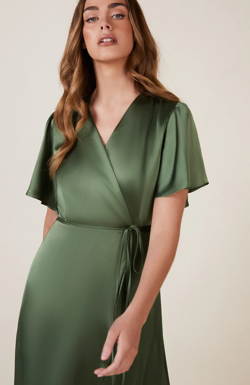 The Florence Waterfall hem bridesmaids wrap dress is crafted in the most beautiful satin.